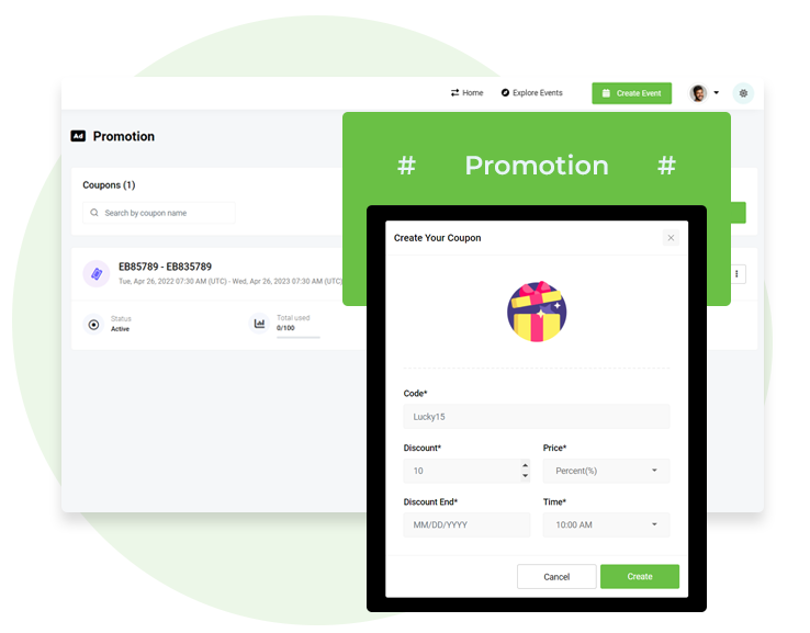 You can use coupons to boost ticket sales. Multiple coupons can be created with additional offers. Create and promote coupons and drive more ticket sales.